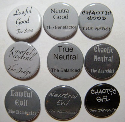 Character alignmentI recently learned of the concept of “character alignment”. This comes from the Dungeons & Dragons community, and is a means of classifying a character’s relative goodness vs. evil and his/her penchant for lawfulness or chaos.